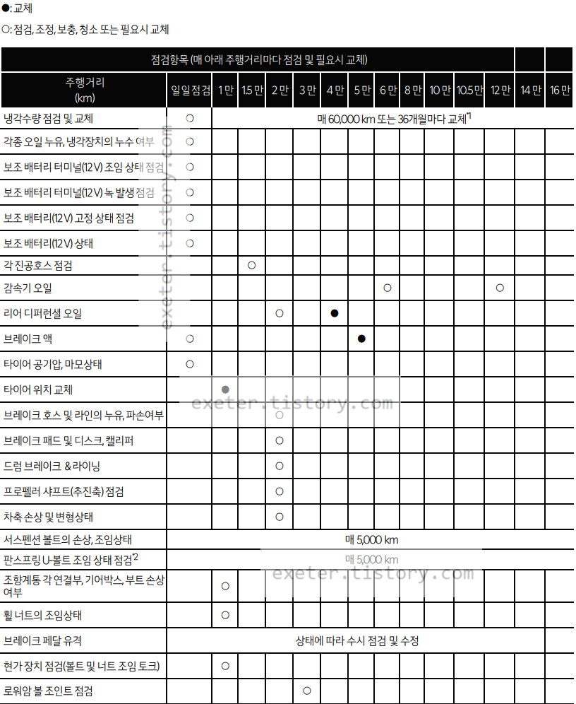 - 리어 디퍼런셜 오일: 매 2만 km 점검 / 매 4만 km 교환