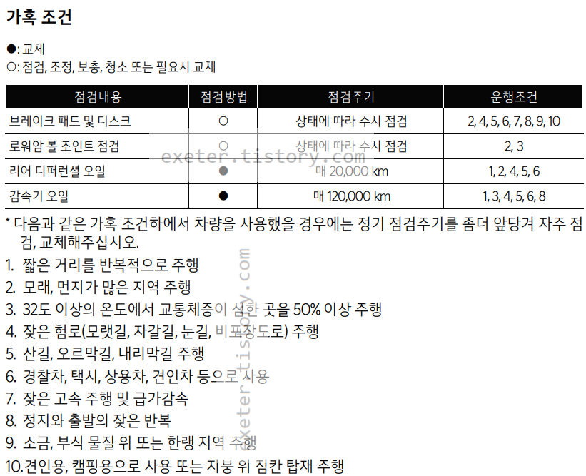 예를 들어 체증이 심한 도심지에서 짧은 거리를 매일 반복해서 주행하고, 정지/출발을 자주 반복 하는 조건은 차량에 있어서는 가혹 조건에 해당될 수 있습니다.