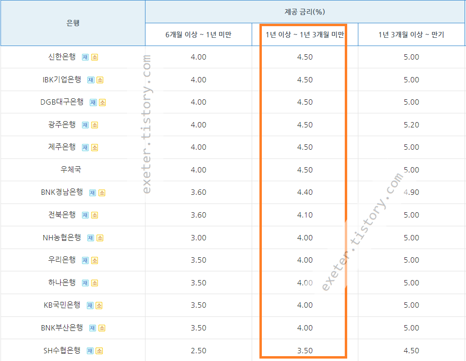 아래는 1년이상 ~ 1년 3개월 미만을 기준으로, 가장 높은 금리부터 정렬 결과입니다.