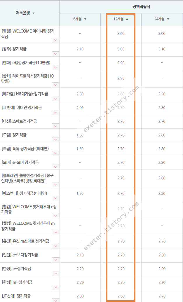 아래 목록에서는 일부 특별한 조건으로 가입해야 고금리를 제시하는 저축은행 상품은 작성자 판단으로 임의 제거했습니다. 따라서 아래에 제시한 상품의 대부분은 비대면/인터넷/스마트폰 가입이 가능한 상품으로, 특별한 부가 조건 없이 제공되는 금리입니다.