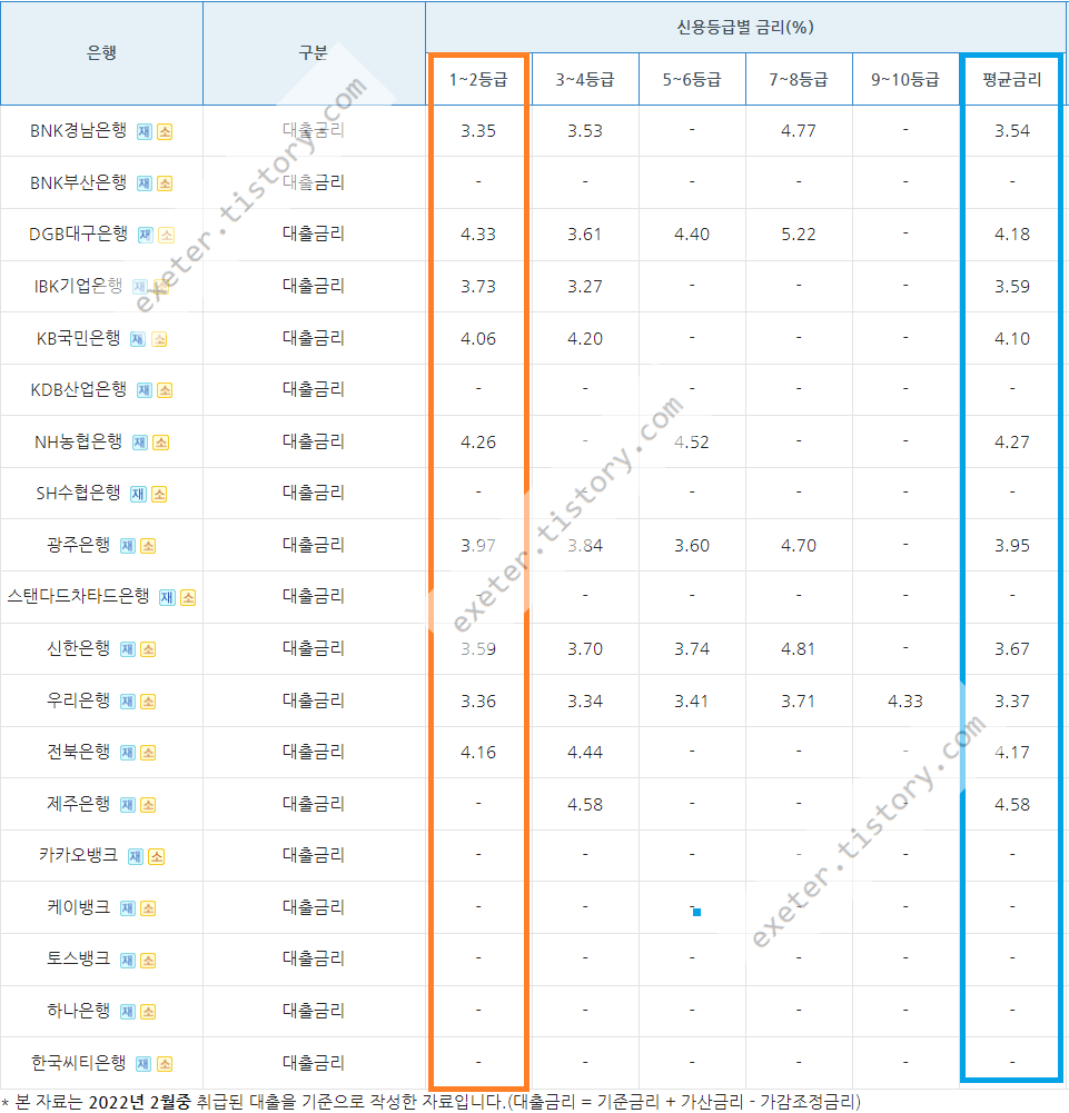 본 게시글은 신용등급에 따른 시중은행 주택담보대출 금리 비교입니다. 참고로, 현재 작성일인 2022년 3월 25일 기준 최신 자료로, 2022년 2월 중 시중은행에서 취급된 주택담보대출 통계를 기준