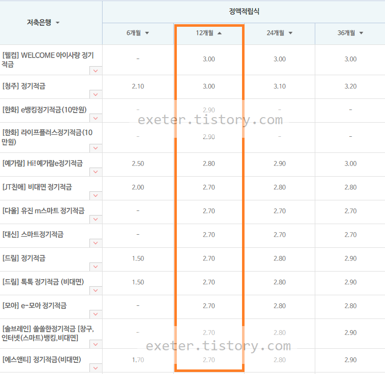 은행 상품명 / 기본금리 (단리 이자(%), 12개월, 높은 금리 순서, 가입 조건/제한(ex. 보험가입 등))