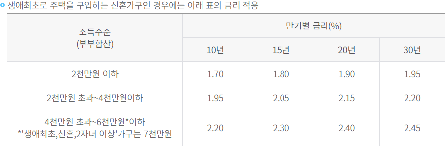 - 생애최초로 주택을 구입하는 신혼가구인 경우에는 아래 표의 금리 적용