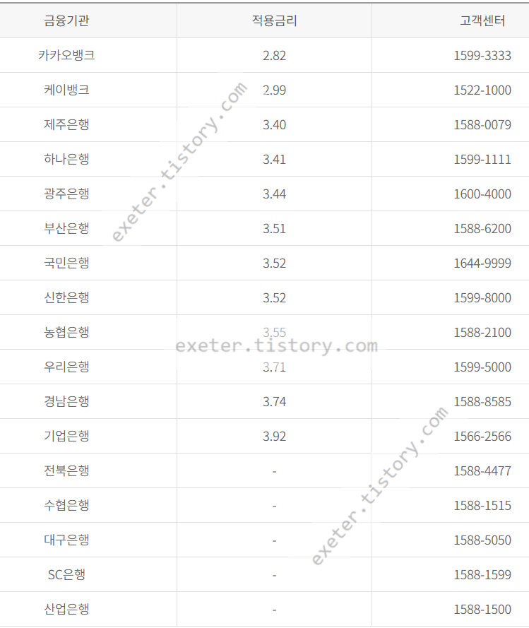 은행과 협약하여 금리를 인하한 상품 등이 포함되어 있어 실제 적용금리와 상이할 수 있으며 실제 금리는 반드시 대출 희망 은행에 확인하시기 바랍니다.