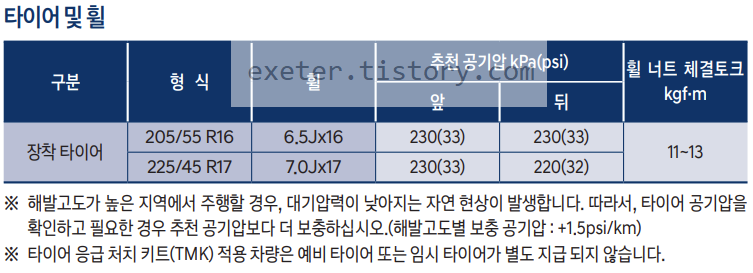 - 타이어 형식 205/55 R16: 앞 33 psi, 뒤 33 psi