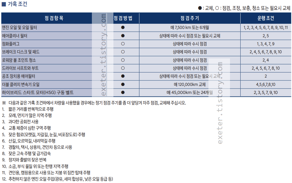 차량 사용 설명서에서는 '가혹 조건'인 경우 교환/점검 주기를 빠르게 가져가도록 안내하고 있습니다.