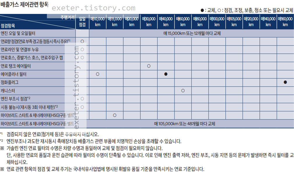 ※ 연료 관련 항목의 점검 및 교체 주기는 국내석유사업법에 명시된 휘발유 품질 기준을 만족시키는 연료 기준입니다