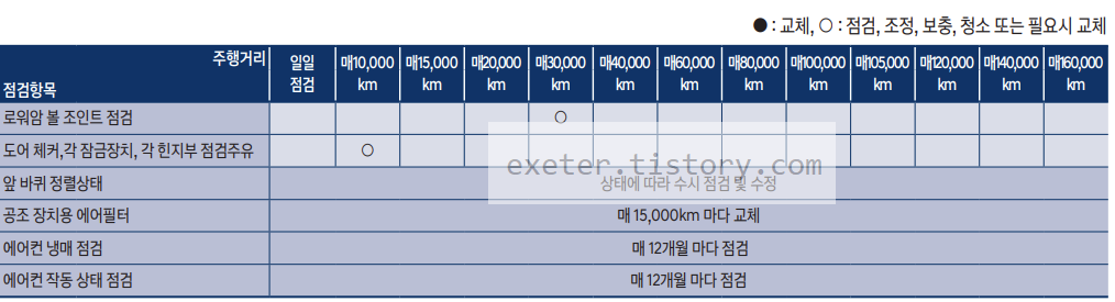 - 에어클리너 필터 점검/교체: 매 10,000 km 점검 및 40,000km 마다 교체