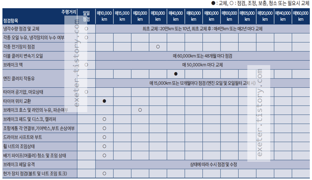 - 더블 클러치 변속기(DCT) 오일 점검: 매 60,000km 또는 48개월 마다 점검