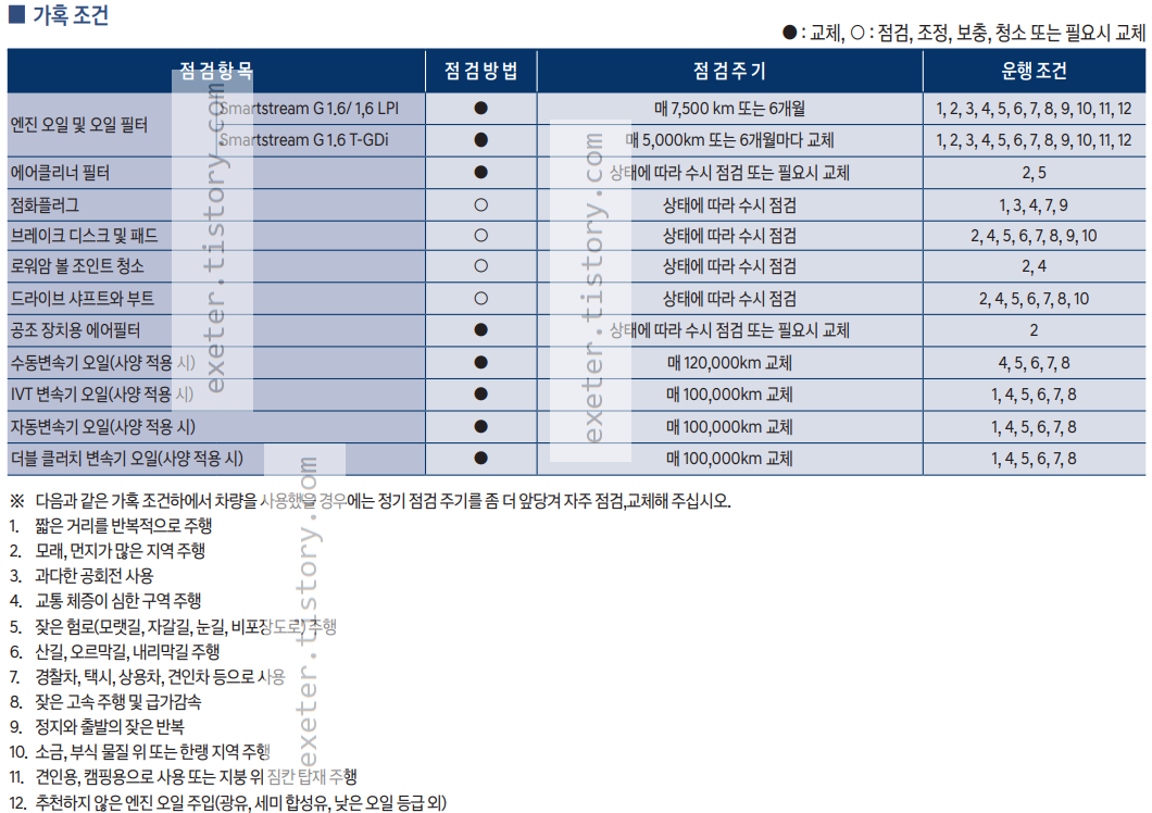 차량 사용 설명서에서는 '가혹 조건'인 경우 교환/점검 주기를 빠르게 가져가도록 안내하고 있습니다.