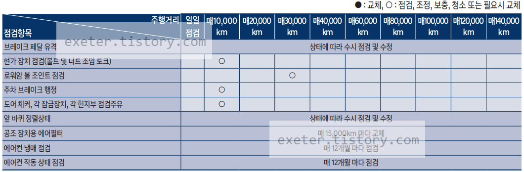 - 에어클리너 필터 점검/교체: 매 10,000 km 점검 및 40,000km 마다 교체