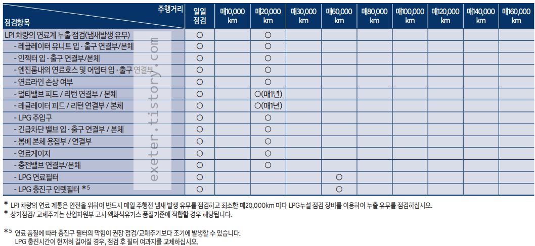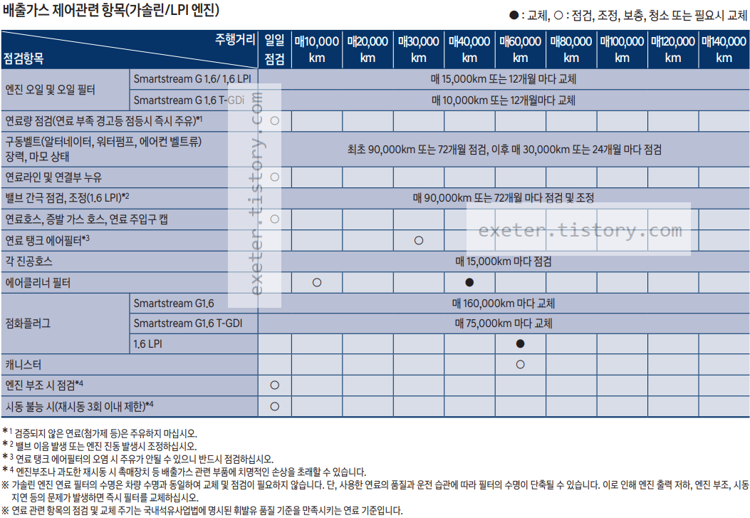 ※ 연료 관련 항목의 점검 및 교체 주기는 국내석유사업법에 명시된 휘발유 품질 기준을 만족시키는 연료 기준입니다.