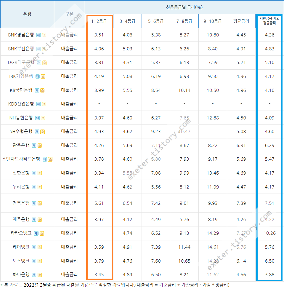 기준: 2022년 3월 취급된 신용대출 / 신용등급 1-2등급 기준