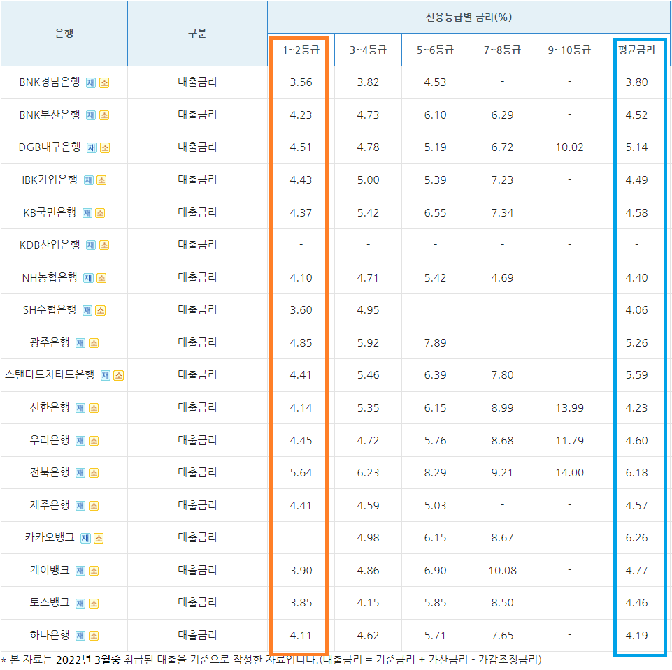 기준: 2022년 3월 중 취급된 신용대출(마이너스 통장) / 신용등급 1-2등급 기준