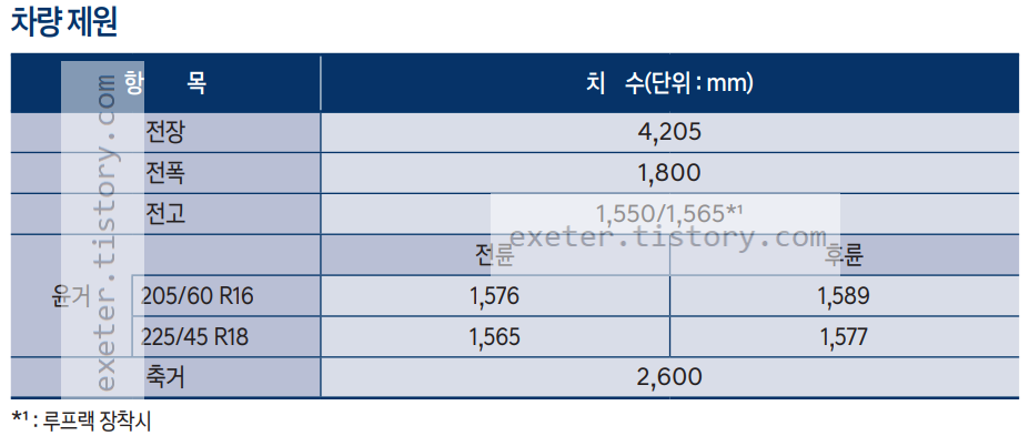 기타 치수제원은 아래 표를 참고 바랍니다.