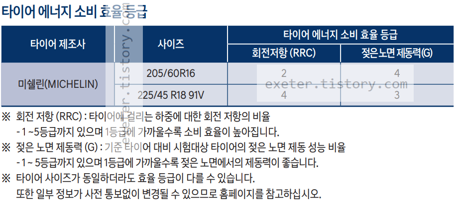 ※ 타이어 사이즈가 동일하더라도 효율 등급이 다를 수 있습니다. 또한 일부 정보가 사전 통보없이 변경될 수 있으므로 홈페이지를 참고하십시오.