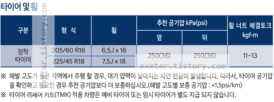 ※ 해발고도가 높은 지역에서 운행할 경우, 대기압력이 낮아지는 자연 현상이 발생합니다. 따라서, 타이어 공기압을 확인하고 필요한 경우 추천공기압보다 더 보충하십시오. (해발고도 별 보충 공기압 : +1.5psi/km)