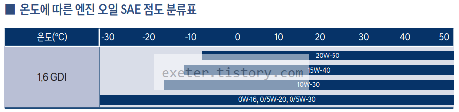 1.6 GDI 엔진: 20W-50, 15W-40, 10W-30, 0W-16, 0/5W-20, 0/5W-30