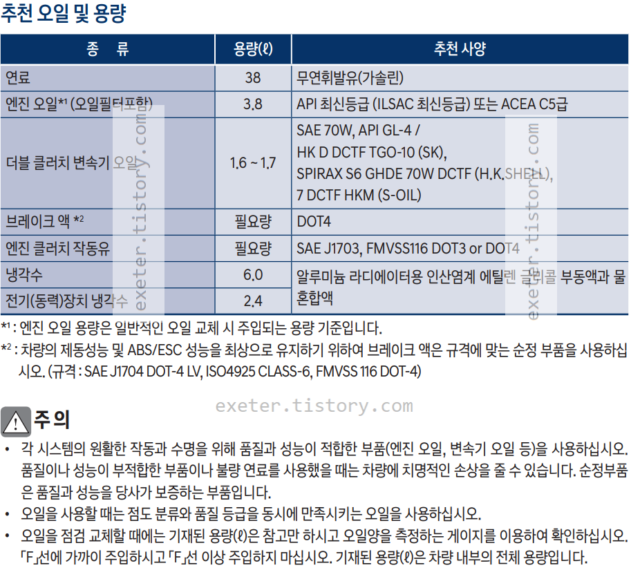 각 오일류 추천(순정) 사양은 아래 표를 참조하세요.