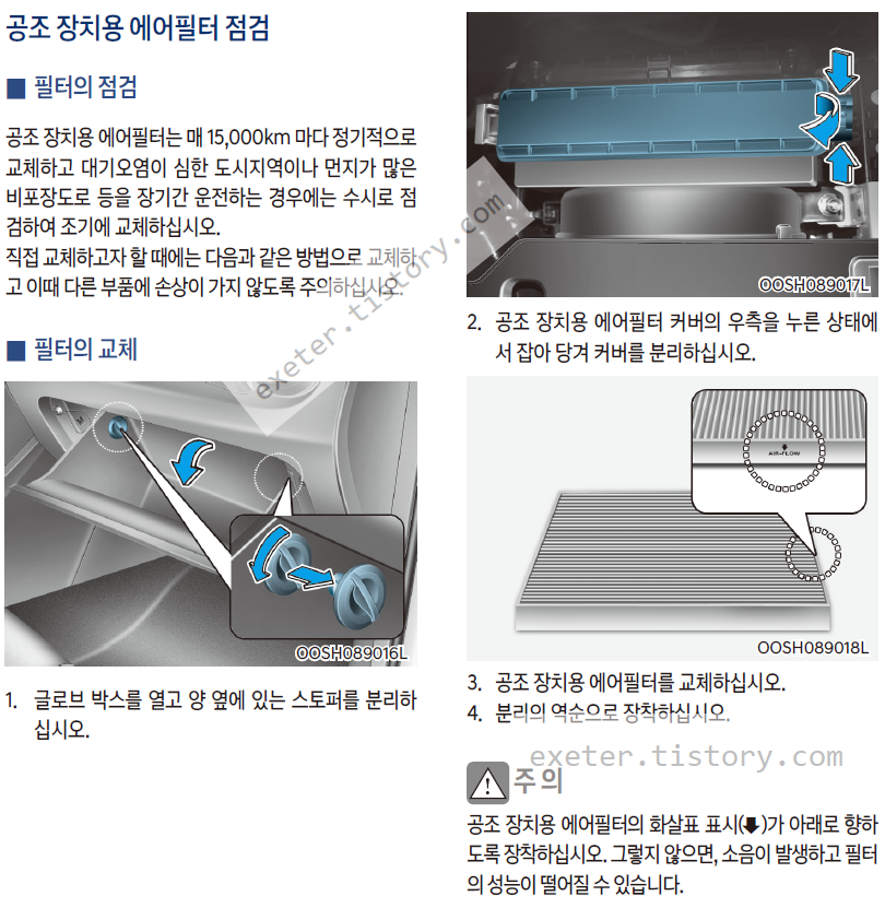 공조 장치용 에어필터는 매 15,000km 마다 정기적으로 교체하고 대기오염이 심한 도시지역이나 먼지가 많은 비포장도로 등을 장기간 운전하는 경우에는 수시로 점검하여 조기에 교체하십시오.