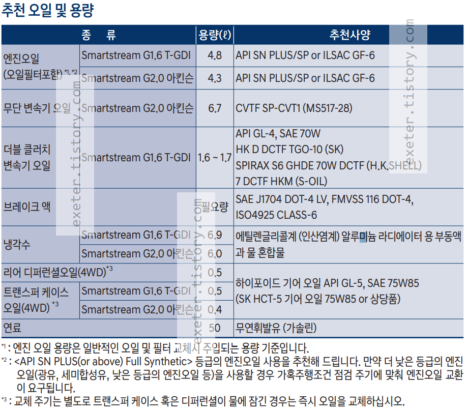엔진 오일(Smartstream G1.6 T-GDI ): 4.8 리터(L) / 규격 API SN PLUS/SP or ILSAC GF-6