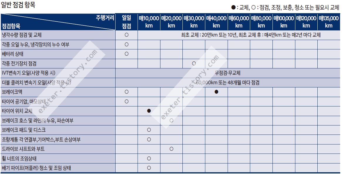 - 더블 클러치 변속기 오일(사양 적용 시): 매 60,000km 또는 48개월 마다 점검