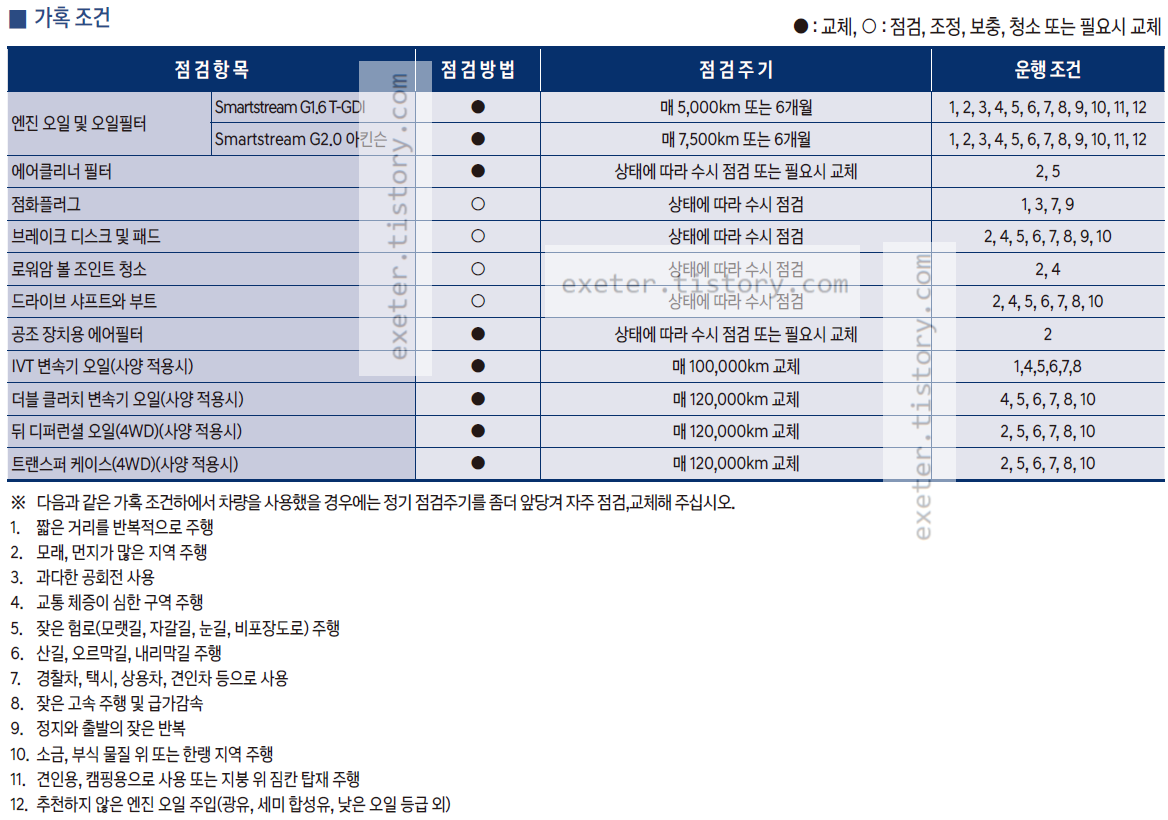 차량 사용 설명서에서는 '가혹 조건'인 경우 교환/점검 주기를 빠르게 가져가도록 안내하고 있습니다.