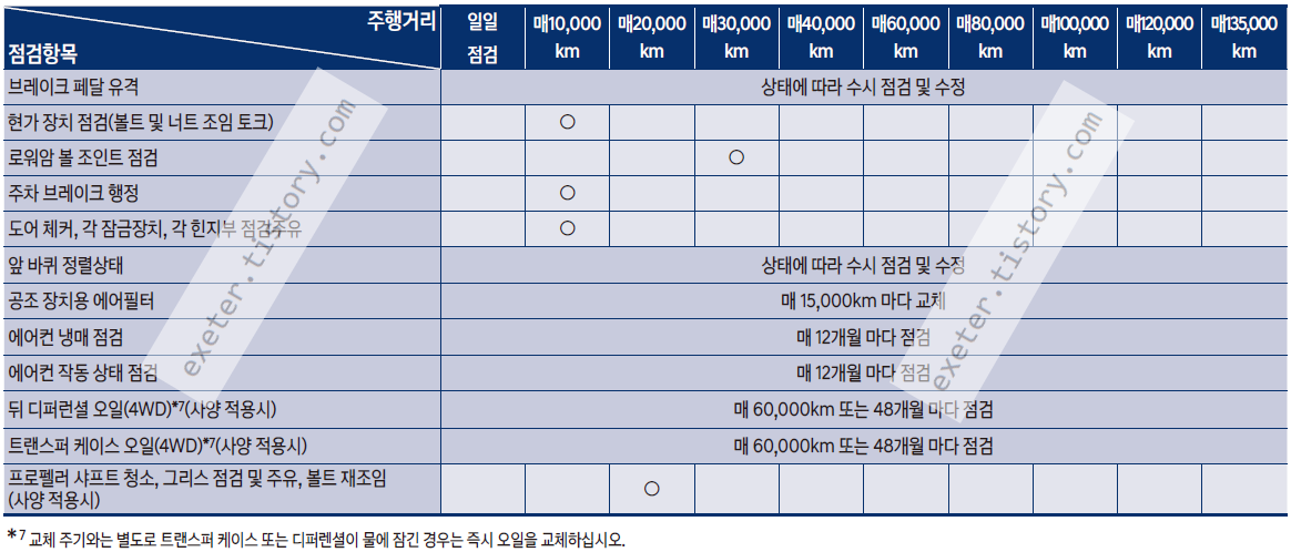 - 뒤 디퍼런셜 오일(4WD)*7(사양 적용시): 매 60,000km 또는 48개월 마다 점검