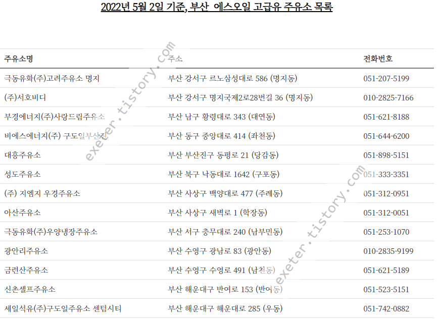 2022년 5월 2일 기준, 부산 에스오일 고급유 주유소 목록