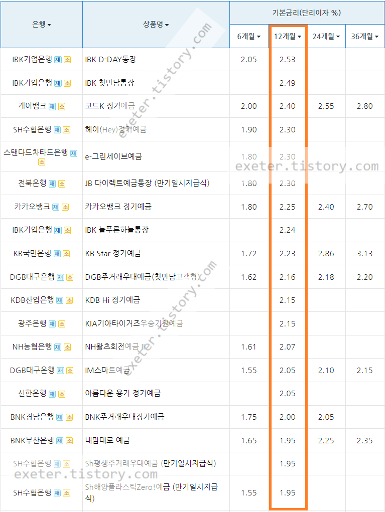 은행 / 상품명 / 기본금리 (단리 이자(%), 12개월 기준)