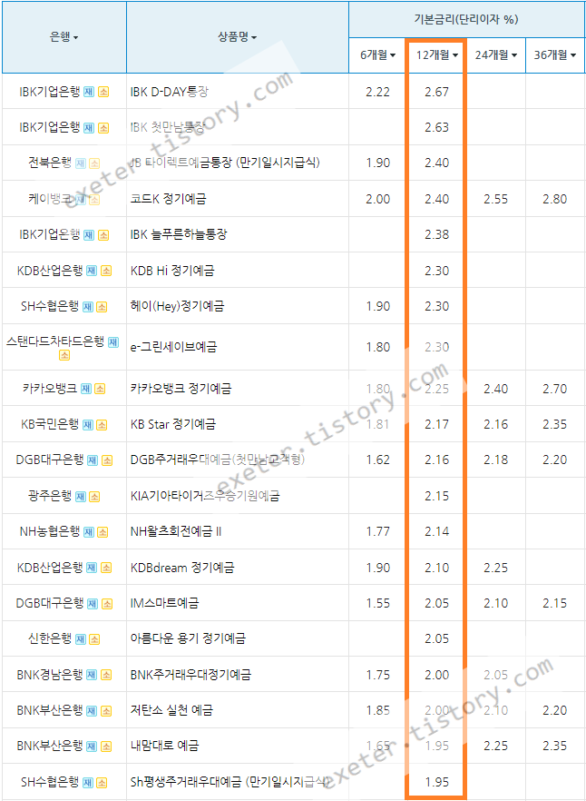 은행 / 상품명 / 기본금리 (단리 이자(%), 12개월 기준)
