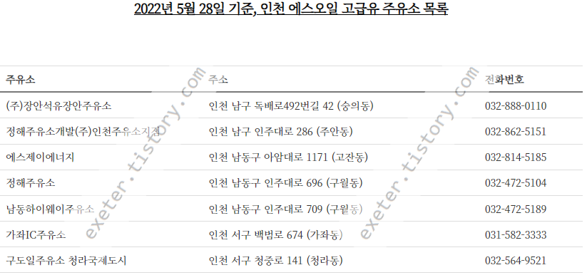 2022년 5월 28일 기준, 인천 에스오일 고급유 주유소 목록