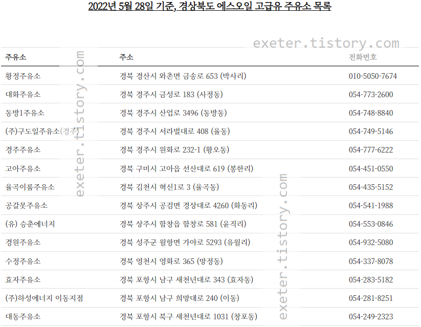 2022년 5월 28일 기준, 경상북도 에스오일 고급유 주유소 목록