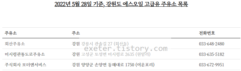 2022년 5월 28일 기준, 강원도 에스오일 고급유 주유소 목록