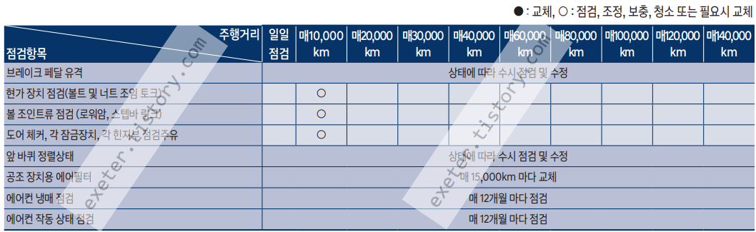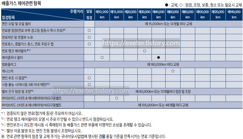 ※ 연료 관련 항목의 점검 및 교체 주기는 국내석유사업법에 명시된 휘발유 품질 기준을 만족시키는 연료 기준입니다.