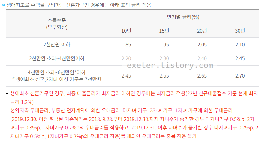 - 생애최초로 주택을 구입하는 신혼가구인 경우에는 아래 표의 금리 적용