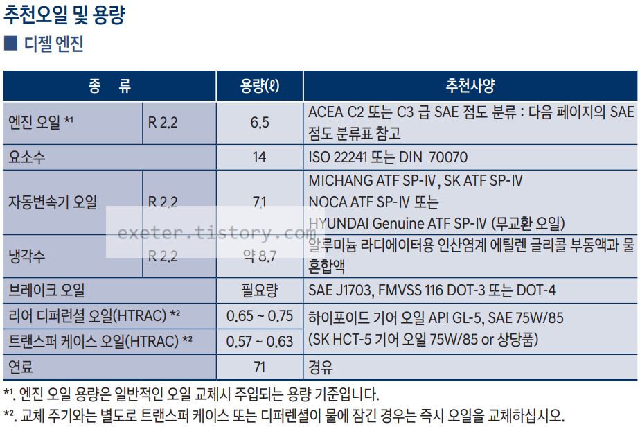 리어 디퍼런셜오일*2: 0.65 ~ 0.75 리터 / 하이포이드 기어 오일 API GL-5, SAE 75W/85(SK HCT-5 기어 오일 75W/85 or 상당품)