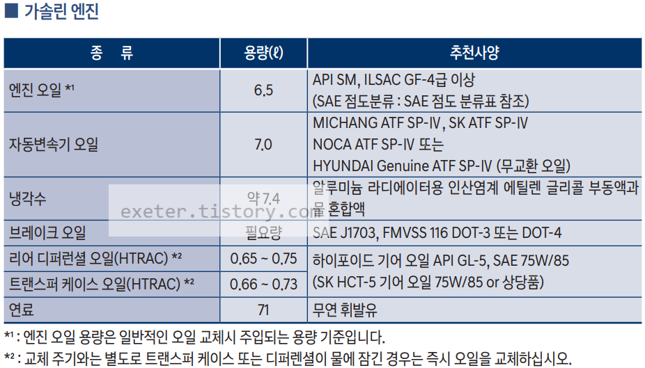 자동 변속기 오일: 7.0 리터 / MICHANG ATF SP-Ⅳ, SK ATF SP-Ⅳ NOCA ATF SP-Ⅳ 또는 HYUNDAI Genuine ATF SP-Ⅳ (무교환 오일)