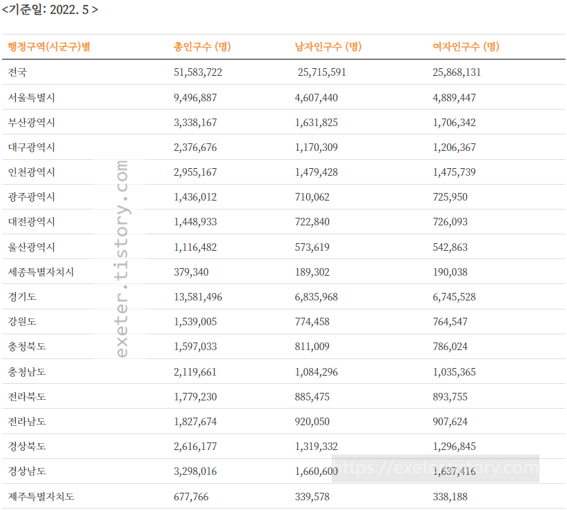 우리나라(대한민국) 인구 통계를 조사해 보았습니다.