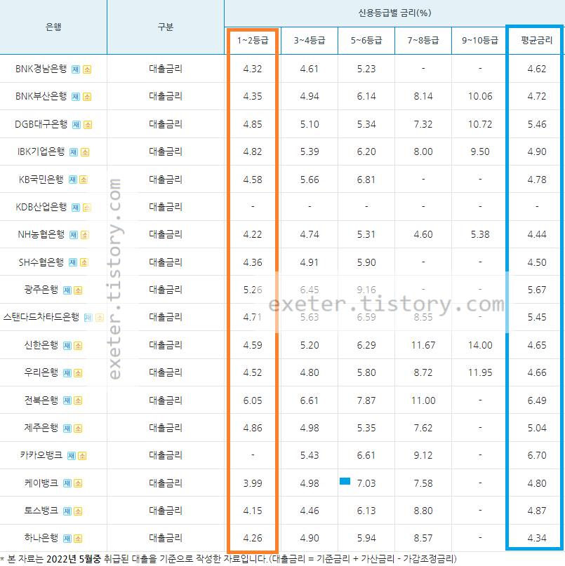 2022년 5월 신용대출(마이너스 통장) / 신용등급 1-2등급 기준 상위 TOP 10 평균 금리는 4.33 % 입니다.