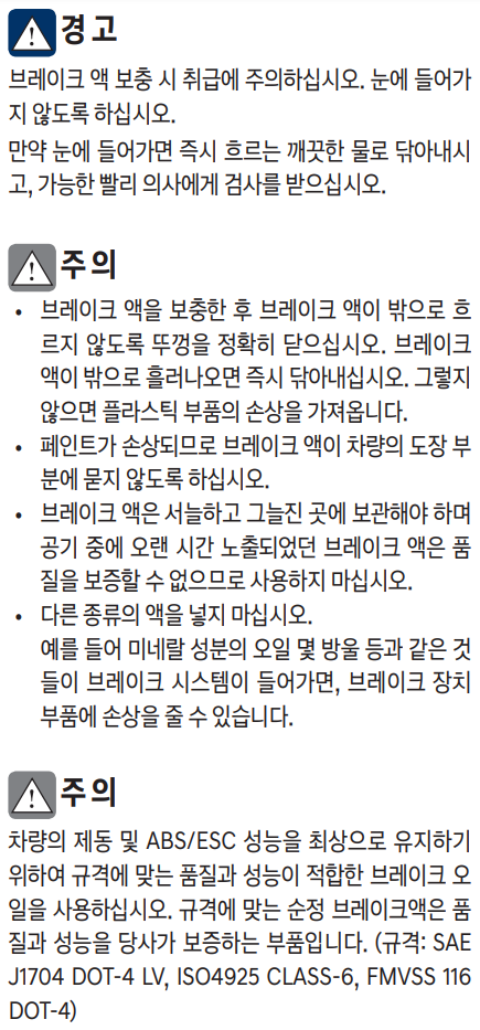 • 브레이크 액은 서늘하고 그늘진 곳에 보관해야 하며 공기 중에 오랜 시간 노출되었던 브레이크 액은 품 질을 보증할 수 없으므로 사용하지 마십시오.