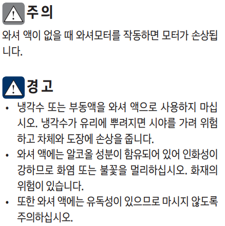 와셔 액이 없을 때 와셔모터를 작동하면 모터가 손상됩 니다.