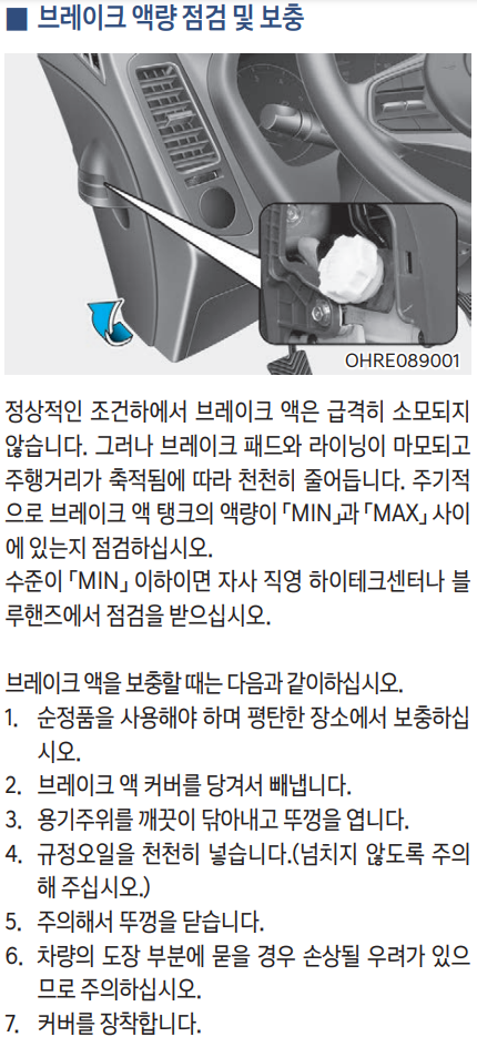 브레이크 액을 보충한 후 브레이크 액이 밖으로 흐 르지 않도록 뚜껑을 정확히 닫으십시오.