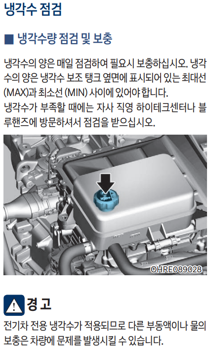 냉각수의 양은 매일 점검하여 필요시 보충하십시오. 냉각 수의 양은 냉각수 보조 탱크 옆면에 표시되어 있는 최대선 (MAX)과 최소선 (MIN) 사이에 있어야 합니다