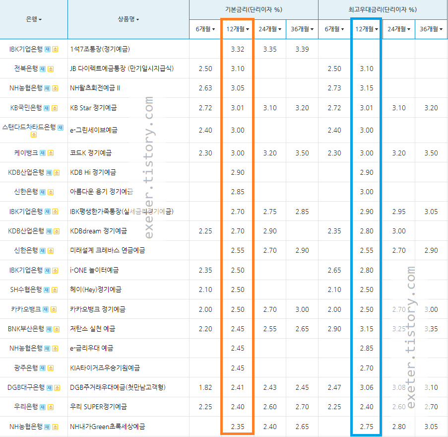 은행 / 상품명 / 기본금리 (단리 이자(%), 12개월 기준)
