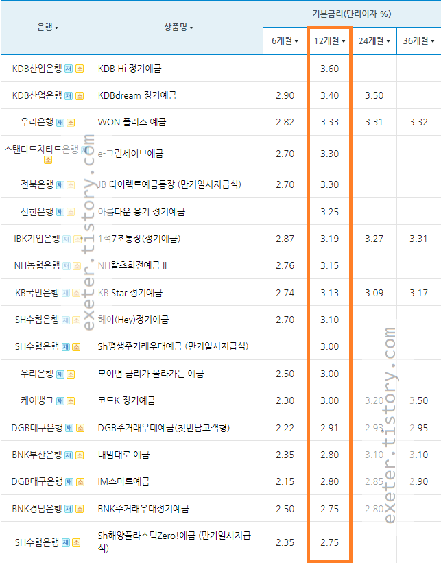 은행 / 상품명 / 기본금리 (단리 이자(%), 12개월 기준)