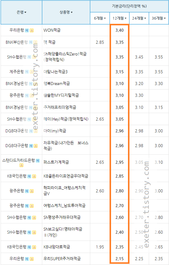 아래는 시중은행 정기 적금 상품 금리를 정액적립식/단리/12개월 기준, 높은 순서로 정렬한 자료입니다.