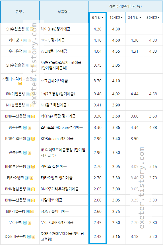 가입기간 6개월 기준으로 수협은행 헤이정기예금이 4.2%의 최고 금리를 보이고, 그 뒤로 케이뱅크, 우리은행순서로 4% 대 수준의 예금 금리를 보이고 있습니다.