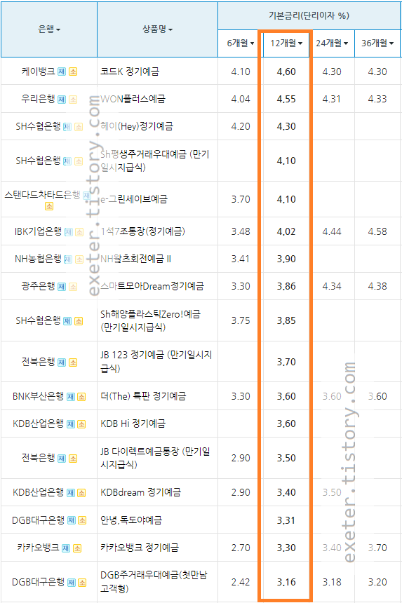 아래는 높은 예금금리 순서로(단리, 12개월 기준) 정렬한 금리표 입니다.