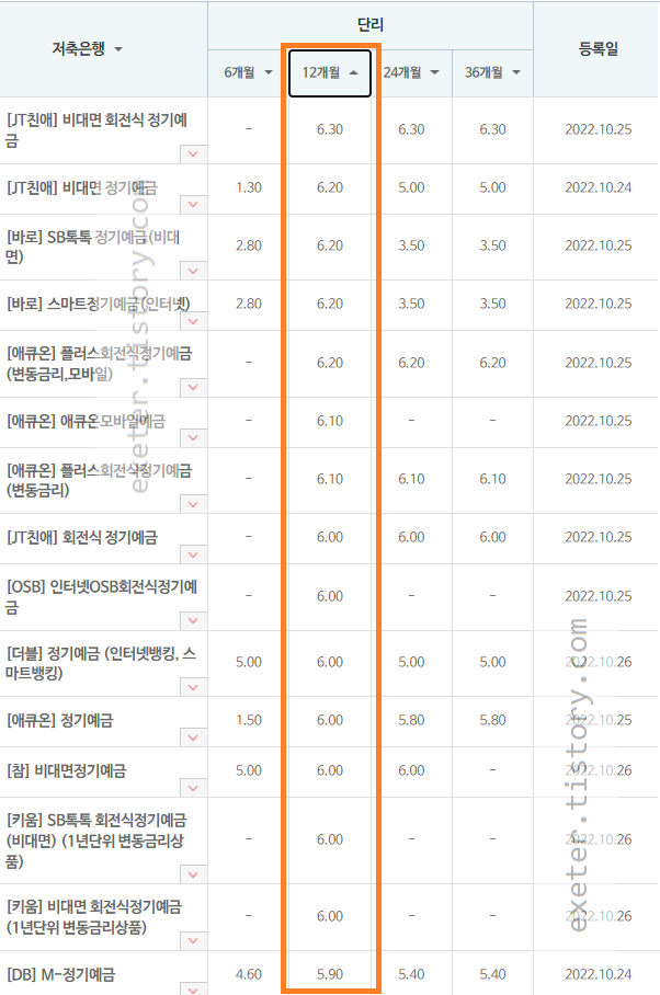 아래는 저축은행 예금금리 12개월(1년) 기준 높은 순서로 정렬한 금리 표입니다.